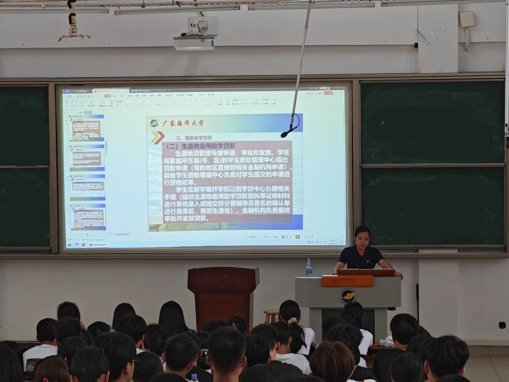 吴老师根据国家资助政策和学校资助工作的精神与要求,按照时间顺序,就新生"绿色通道"、广东省大学新生资助专项、国家助学贷款、国家奖助学金、优秀员工奖学金和社会奖助学金、勤工助学、临时困难补助和应征入伍国家资助等方面进行了详细解读与说明。吴老师要求同学们做好规划,合理消费,拒绝攀比,诚实守信,将助学金用在真正需要的地方,申请了生源地助学贷款的同学毕业后按时还款,并说明了不按时还款的严重后果。