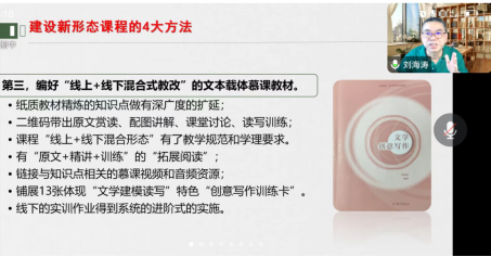 首先,岭南师范学院线上线下混合式国家级一流课程获得者刘海涛教授分享了自己《文学创意写作》国家级一流课程建设与申报的经验体会:一是从写作课程改革建设的基本出发点,指出了写作课教学面临的三大痛点,以及课程改革和教材编写经历的三大转型。二是提出了新时代新技术背景下的教改转型路径、建设新形态课程与教材的四大方法、新时代创意写作教师的修炼路径。三是课程成果以“慕课、音频课、专栏、论文、教材”全媒体出版。随后,刘海涛针对如何调动员工学习积极性、教材编写与一流课程教材选择等内容与学院老师进行了热情的互动交流。