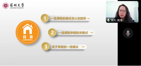 然后,深圳大学威廉希尔中文官网金融系副主任、副教授陈莹博士介绍了自己《金融学》国家级一流课程建设与申报的经验体会,解读了教育部一流课程建设相关文件精神,分析了一流课程五种类型的不同特点、不同评审标准,尤其是一流课程建设的基本原则,国家级一流课程建设、认定趋势、申报的关键点、否决条件等建设和申报技巧。随后,陈莹围绕申报一流课程的基本要求与难点给老师们提出了一些具体建议,并就一流课程申报对申报人与主讲人的相关要求、如何体现课程思政元素和凝练课程特色和亮点、如何克服在一流课程建设过程中员工的负面情绪、如何录制视频课以及如何兼顾师生互动环节和有限课时之间矛盾等老师所提问题给老师们进行了耐心而细致的解答。