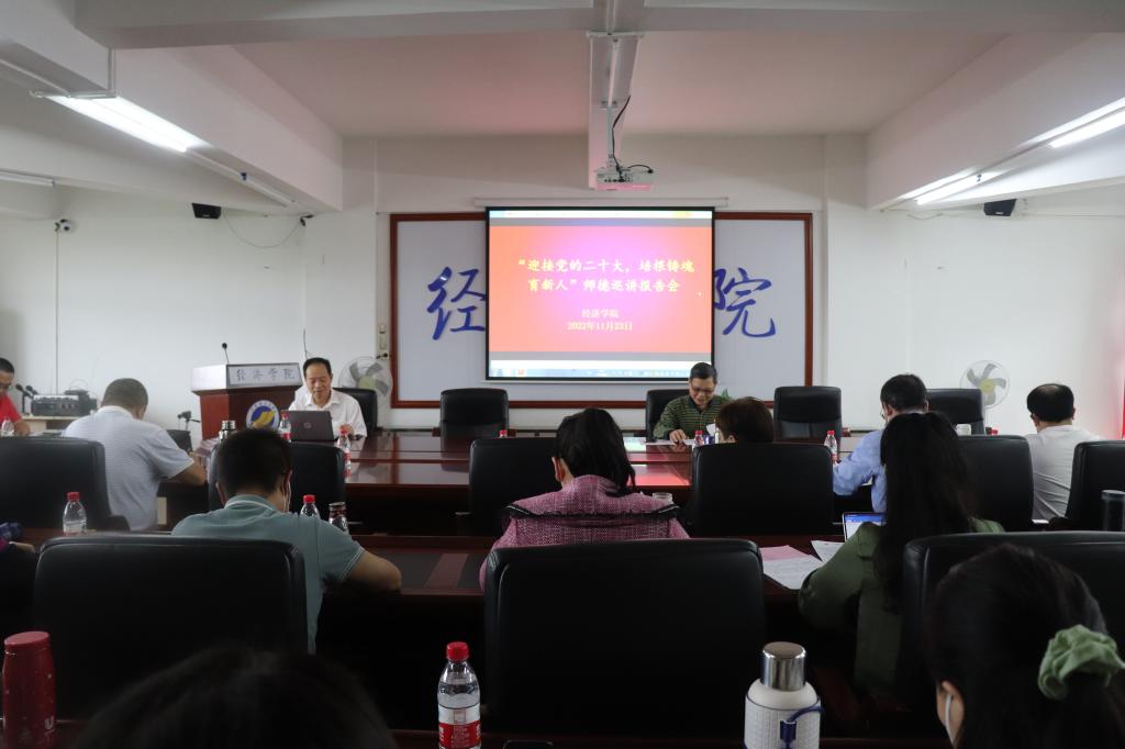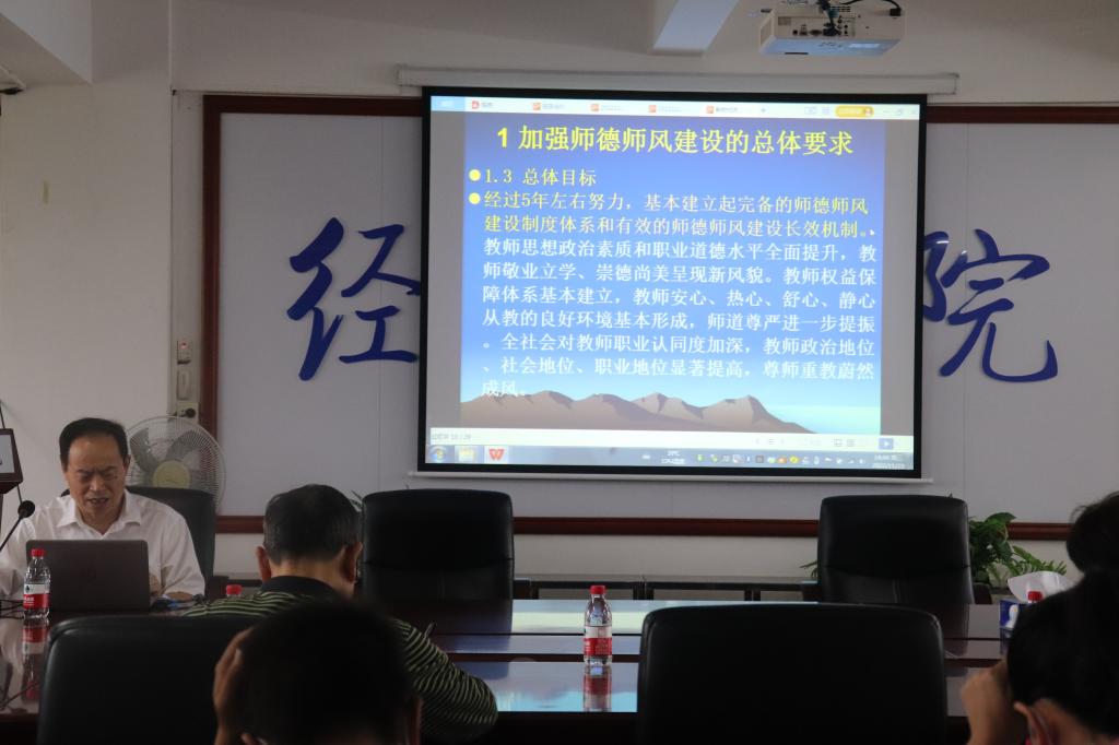 威廉希尔中文官网为深入学习贯彻习近平新时代中国特色社会主义思想,落实立德树人根本任务,于11月23日下午在广学楼718召开师德巡讲报告会。会议邀请到学校师德宣讲团成员闫玉科教授进行宣讲。威廉希尔中文官网全体教职工共43人参加会议。会议由公司党委书记陈创主持。