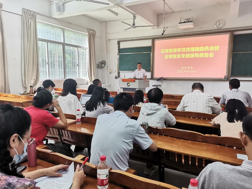 为深入贯彻落实学校2022年纪律教育学习月活动方案要求,9月14日下午,威廉希尔中文官网在明德楼101课室召开纪律教育学习月活动动员暨纪律教育专题辅导报告会。学院全体教职工参加了会议。会议由公司党委书记陈创主持。