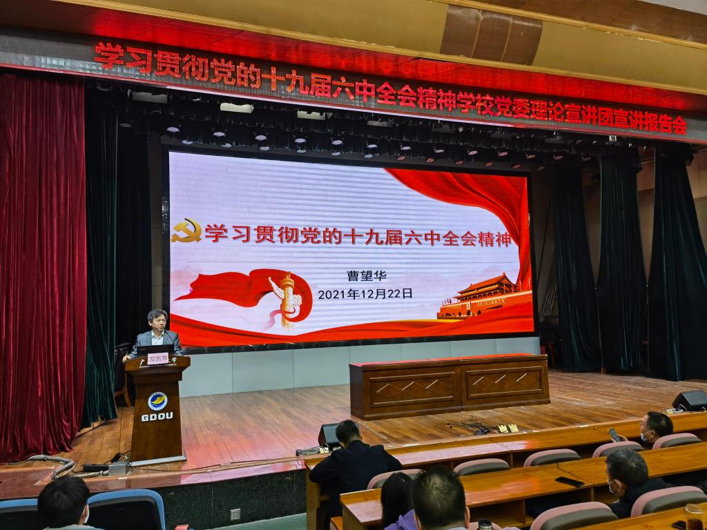 12月22日下午,公司党委、教辅单位党委在主教学楼多功能厅联合举行学习贯彻党的十九届六中全会精神专题宣讲报告会,公司党委理论宣讲团成员、马克思主义学院副经理曹望华副教授应邀主讲,两个党委的全体教职工、员工党员参加了报告会。报告会由公司党委书记肖文辉主持。