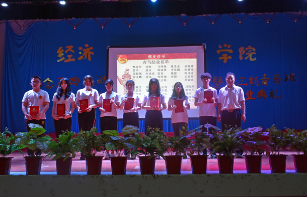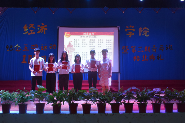 到会领导为青马学员、青马优秀学员、青马班助理颁发了证书,并合影留念。与会师生还通过观看视频回顾了本期青马培训班,优秀学员代表作了交流发言。全体青马学员还通过情景剧《送别》、杯子舞《稻香》、小品《青春向上》、诗朗诵《我骄傲,我是中国人》、合唱并手语舞《我和我的祖国》等汇演节目作了学习成果汇报。