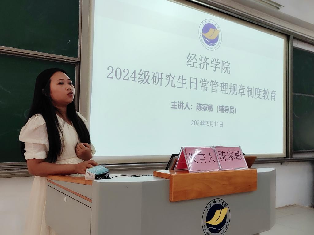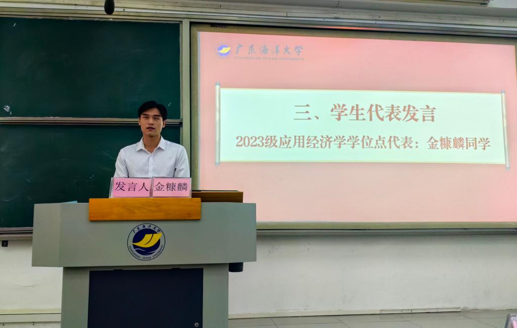 辅导员陈家敏老师讲解了研究生日常管理的规章制度和纪律要求,帮助新生们尽快熟悉学校相关要求,为接下来的学习生活做好准备。应用经济学专业2023级研究生金糠麟同学发言,结合自己的学习和生活经历,鼓励新生要明确目标,躬身实践,勇于探索,勇敢追梦。研究生新生代表林亚表达了对老员工活的憧憬和期待,表示将以全新的身份,怀揣梦想,勇攀高峰。