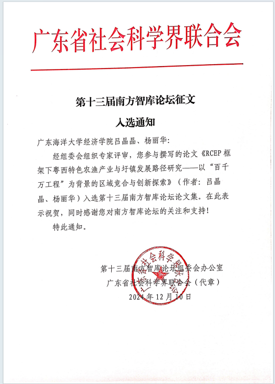 作为2024年williamhill中国官方网站海洋经济与管理研究中心提升项目、2024年williamhill中国官方网站“双百行动”项目《RCEP框架下湛江特色农渔产业高质量发展模式》的阶段性成果,该论文基于区域竞合理论,提出了一套系统全面的协同发展路径,着重从产业协同、区域协同以及社会协同三个维度发力,致力于推动粤西特色农渔产业与圩镇达成高效协调发展的目标。