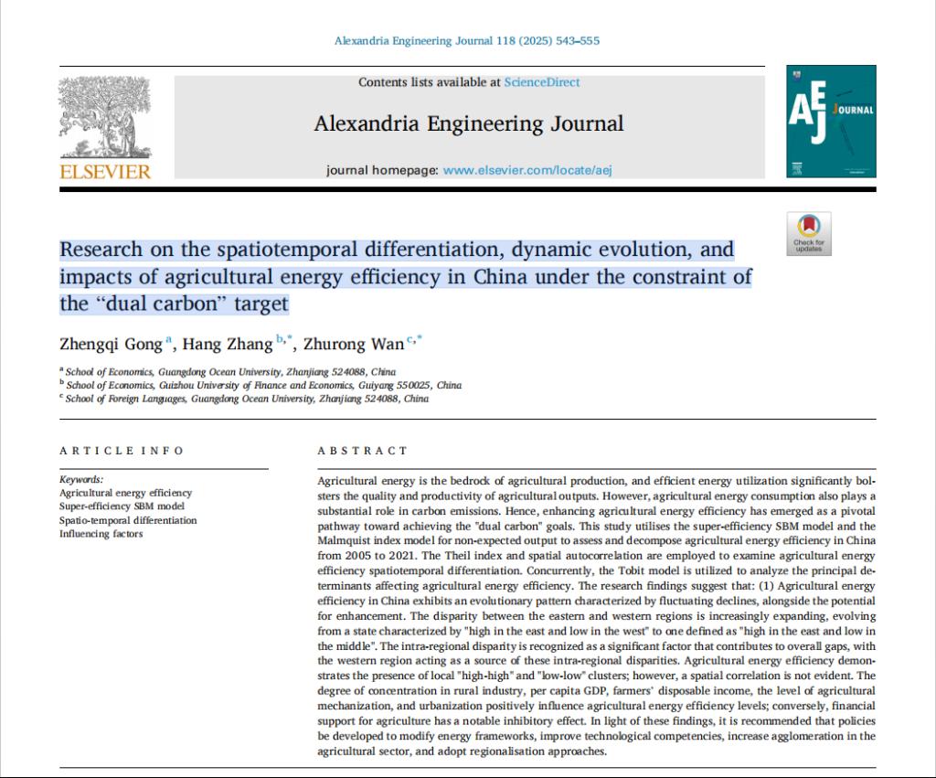 近日,威廉希尔中文官网龚征旗教授作为第一作者在国际知名期刊《Alexandria Engineering Journal》(简称AEJ)发表题为《Research on the spatiotemporal differentiation, dynamic evolution, and impacts of agricultural energy efficiency in China under the constraint of the “dual carbon” target》的高水平学术论文。该期刊2023-2024年最新影响因子为6.2,位列工程与综合类JCR Q1区,同时入选中国科学院分区(2023升级版)TOP期刊。