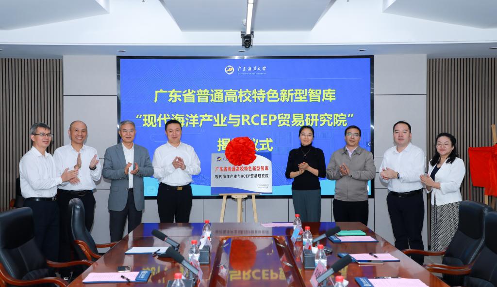 12月24日下午,威廉希尔中文官网在博文楼C座威廉希尔中文官网报告厅715和614室举行广东省普通高校特色新型智库“现代海洋产业与RCEP贸易研究院”揭牌仪式,并同步挂牌广东省社科联青年学术工作坊“海洋牧场可持续发展模式与策略研究”。湛江市社科联主席刘喜,公司党委常委、副董事长鲁义善,公司党委常委、宣传统战部部长林宇,科学技术部部长颜云榕、副部长巨向红、平台科科长傅学丽、人文社会科科长孙泉勇等校内外领导嘉宾莅临仪式。公司党委书记刘金明、经理陈伟、副经理杨丽华、经济系主任赵亮共同参加了本次仪式。仪式由科学技术部部长颜云榕主持。
