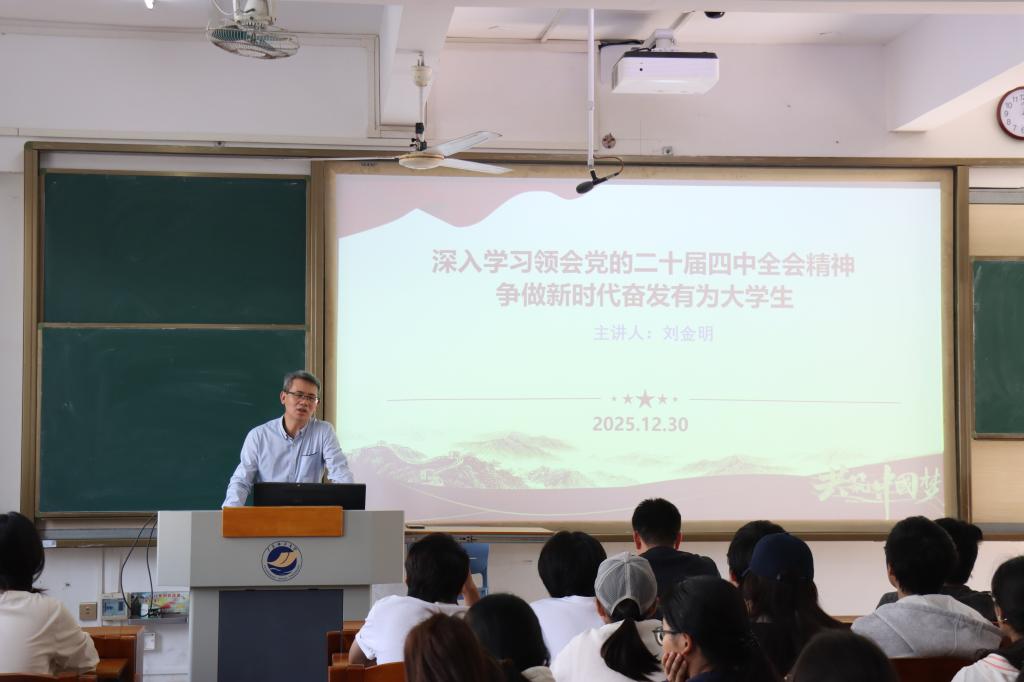 12月30日下午,经济公司党委书记刘金明以《深入学习领会党的二十届四中全会精神,争做新时代奋发有为老员工》为题,在湖光校区明德楼B1201教室为120多位员工干部和员工党员讲授思政课。