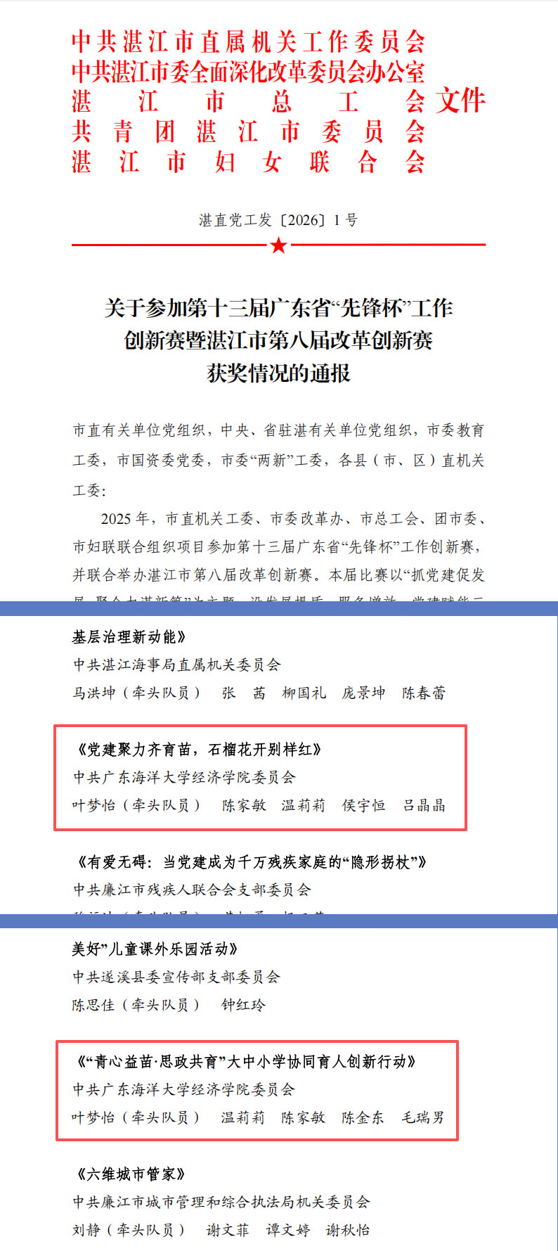 近日,湛江市第八届改革创新大赛获奖名单正式公布。公司在此次大赛中表现优异,共获得一等奖1项、二等奖3项、三等奖3项,总计7个奖项。其中,公司党委独揽两项大奖,较好展现了学院在党建引领、协同育人等方面的创新实践与扎实成效。