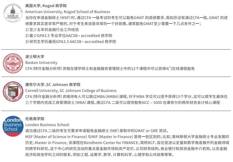 国外商科名校(例如波士顿大学,康奈尔大学,伦敦商学院,多伦多大学等)的商学院在申请职工时,阶段性通过CFA考试可豁免GMAT的成绩要求,部分学校可获得课程豁免。全球更多CFA合作名校及课程,可查阅CFA协会官网。