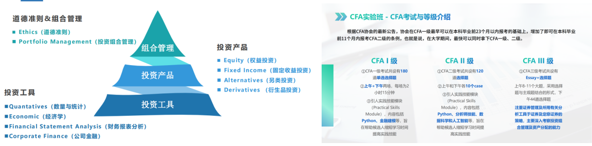 在经济全球化的背景下,金融科技、数字经济快速发展,为满足经济社会发展对国际高端金融专业人才的迫切需求,公司联合高顿教育共同开设CFA菁英班,CFA菁英班,面向全校选拔招生并进行重点培养。