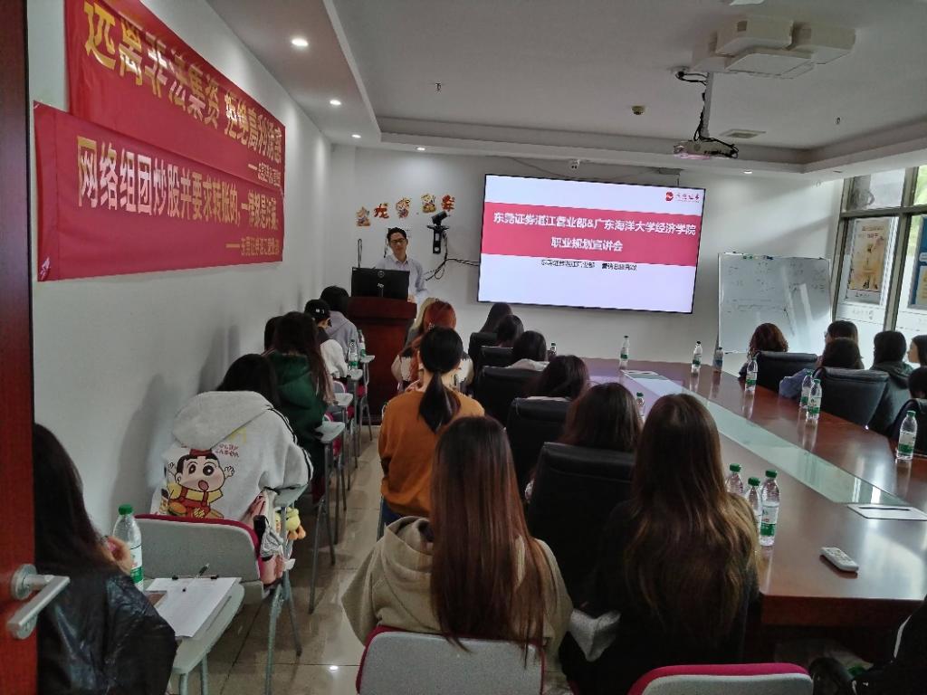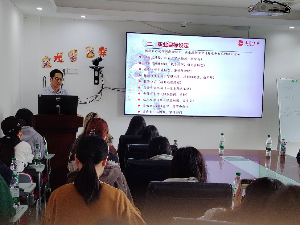 活动由等多位资深金融人士主讲。活动包括专题讲座、座谈会和营业部参观等部分。在专题讲座中,东莞证券湛江营业部副总经理郑强、区域总监袁小君分享了金融行业的职业发展路径。他们结合自己的职业经历和行业趋势,为员工深入剖析了从业者在不同阶段可能面临的机遇和挑战。他们还特别提到,当前中国金融市场的数字化转型为年轻人提供了广阔的发展平台,希望同学们能够注重理论与实践相结合,做好职业规划。