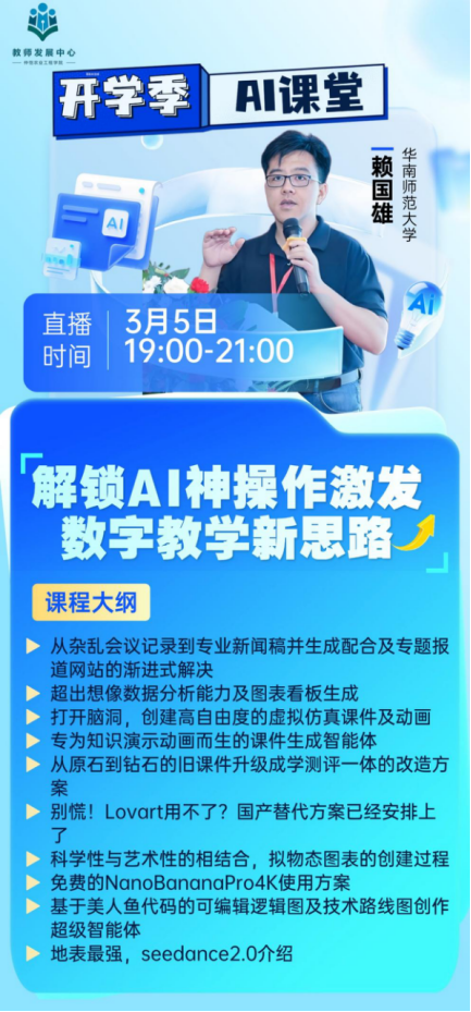 为主动应对高等教育数智化转型浪潮,全面提升教师人工智能应用能力,2026年3月5日,威廉希尔中文官网正式启动“2026年人工智能团队培训计划”,并成功开展首期专题培训。本次培训以《AI驱动的多模态教学资源开发实战》为主题,由华南师范大学网络教育学院赖国雄主任主讲。威廉希尔中文官网全体教师通过线上直播方式参与培训。