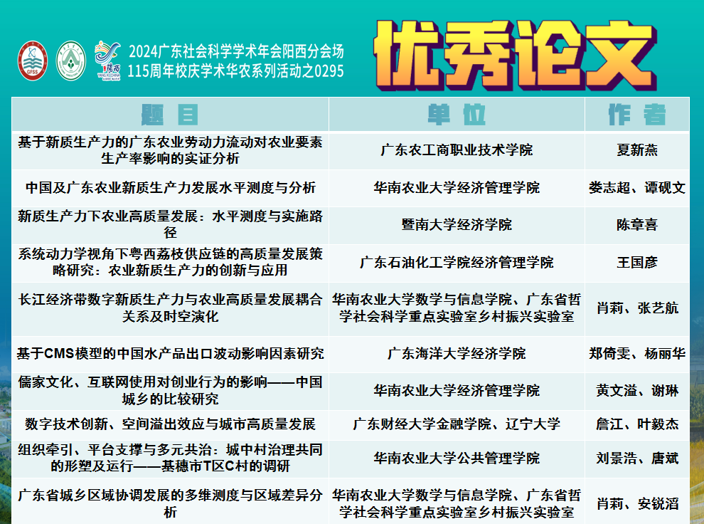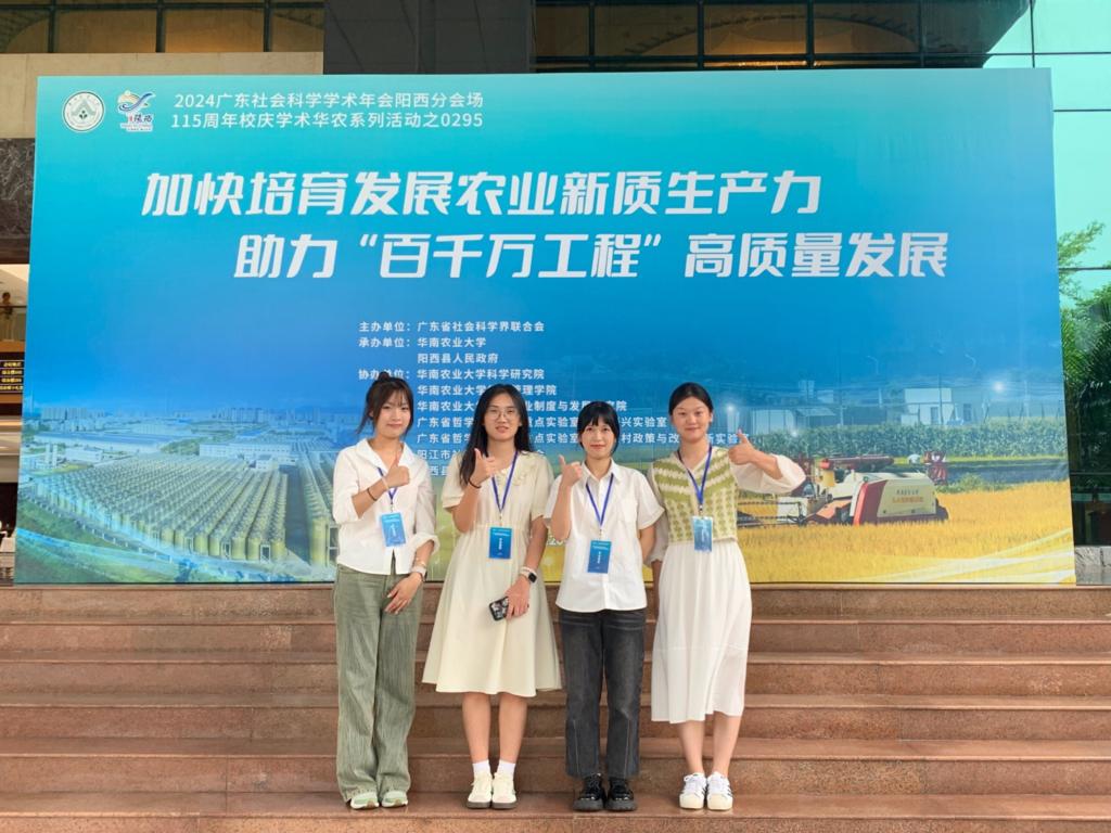 2024年9月20日至21日,2024广东社会科学学术年会阳西分会场在阳西县举行。研讨会由广东省社会科学界联合会主办,华南农业大学和阳西县人民政府协办。公司杨丽华教授指导的研究生郑倚雯、纪晓珂、胡佳和朱楚君受邀参会,其中农村发展专业郑倚雯同学在“专题三:新质生产力与农业高质量发展分会场论坛”作学术报告。