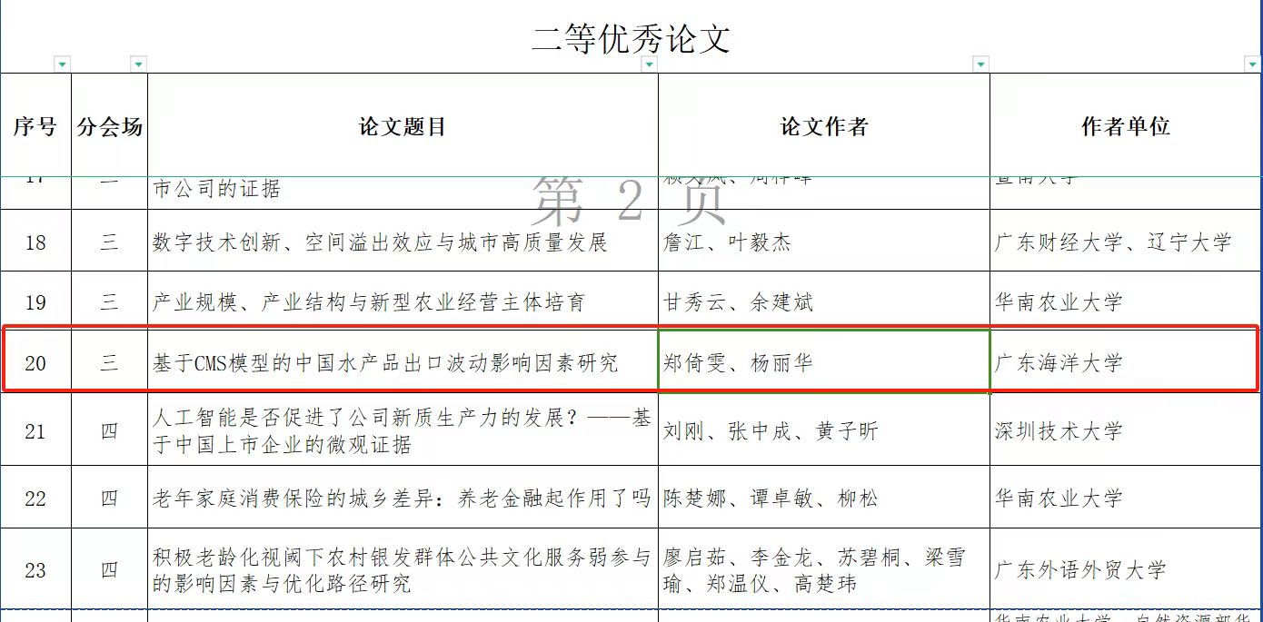 2024 年11月29日,广东省社会科学界联合会于广东人文社科网正式公布2024年广东社会科学学术年会优秀论文名单。其中,威廉希尔中文官网研究生郑倚雯与导师杨丽华教授合作完成的学术论文《基于 CMS 模型的中国水产品出口波动影响因素研究》荣获优秀论文二等奖。该论文以大食物观视角切入,针对中国水产品出口波动的影响因素展开深入的实证分析。研究成果表明,出口竞争力效应是造成中国水产品出口波动的关键因素,基于此研究结论,论文提出了具有针对性的对策建议。