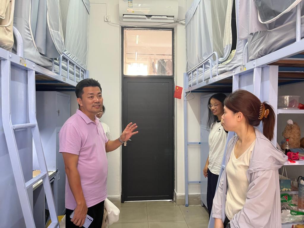 走访过程中,钟桂安一行轻步进入宿舍区域,直奔员工居住房间,以务实作风省去冗余流程。在宿舍内,团队逐一查看床铺稳固性、衣柜使用状态及空调运行情况,对发现的设施隐患当场记录,叮嘱辅导员及学工团队主动对接后勤工作,通过常态化沟通与跟进,全力为同学们营造安全、温馨的住宿氛围。