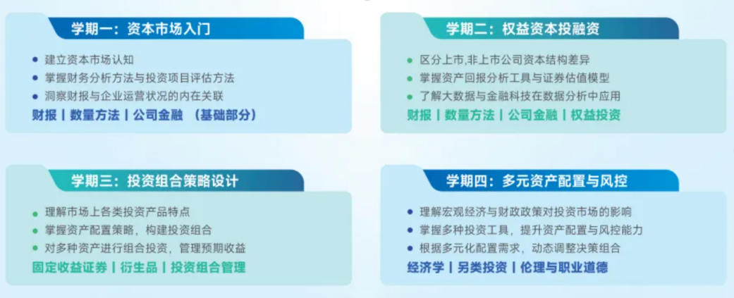 CFA菁英班结合经济金融高端人才实际需求缺口,构筑经济人才培养体系,率先引领课程从传统的「金融+」思维向「金融×AI」的深度融合转型。课程系统融汇经济金融理论学习、实践实习与AI数据化处理等前沿技术深度应用,培养一批具有综合经济金融思维的应用型人才。