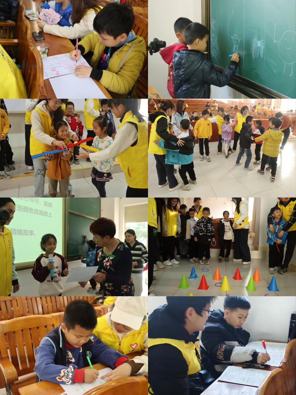 本次活动得到精心策划。首先由党员同志们组织开展学业辅导,向小朋友们悉心传授柳比歇夫时间统计法,帮助小朋友们学会合理规划时间,以提高学习效率。然后以心理健康为主题开展游戏活动。活动设置“心圈相连” “情绪传递”“爱的抱抱” “情绪表演游戏”“爱的手掌”“情绪故事接龙”“情绪调色盘” “情绪猜猜猜”等游戏,孩子们在欢声笑语中,不断提升着对情绪的认知与理解能力,犹如一颗颗璀璨的明珠,串联起了孩子们心灵成长的项链。游戏结束后,小朋友们纷纷踊跃分享自己在游戏中的深刻感悟,稚嫩的话语充满了对自我成长的喜悦与对未来的美好憧憬。